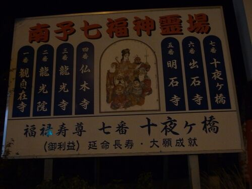 GoToトラベル割引を利用して予約したスーパーホテル愛媛大洲インターに夜9時半少し前に到着。 ホテル隣の大阪王将で飲酒と食事を手早く済ませ、ホテルから60mほどのところにある十夜ヶ橋にほろ酔い加減で歩いて向かう 国道56号線に面して立つバス停看板。 今…